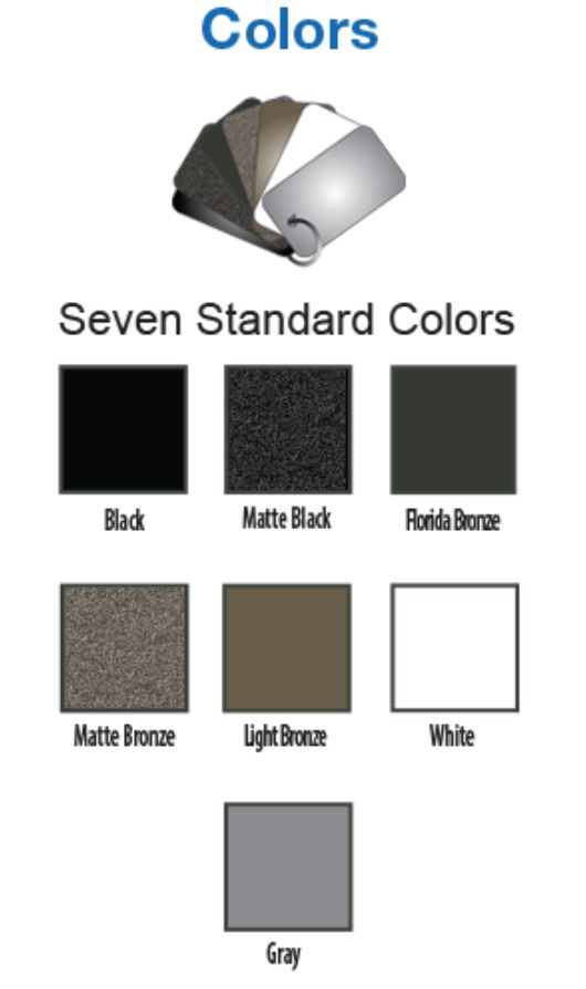 "Alumi-Guard™ Aluminum products are constructed with heavy wall aluminum extrusions and are finished in Armor-Guard™ TGIC polyester powder coating. Tested in Florida's hot, humid, high salt concentrated environment, our finish surpasses the 4000-hour salt spray test - which is more than double what the AAMA mandates! Because Armor-Guard™ powder coating is twice as thick and twice as hard as baked-on enamel finishes, it is much more durable and will look attractive now and for a very long time. Alumi-Guard™offers a lifetime limited warranty on the finish and workmanship of all its materials.
